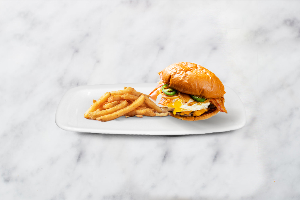Fresh grilled ground beef, double smoked bacon, 1 fried egg, Canadian cheddar cheese, jalapeno, caramelized onion and garlic mayo | 1520 Cals